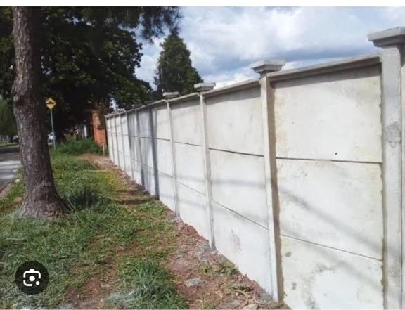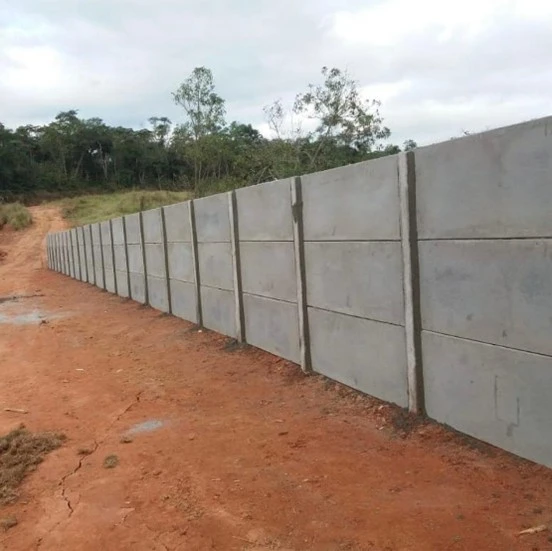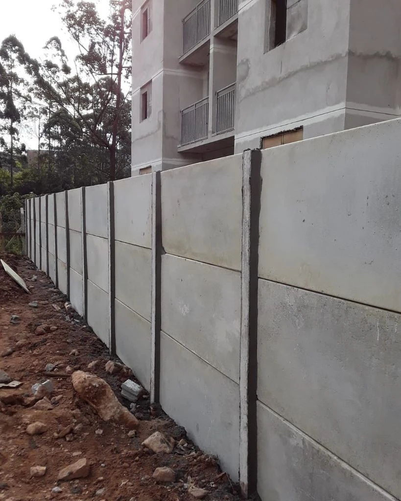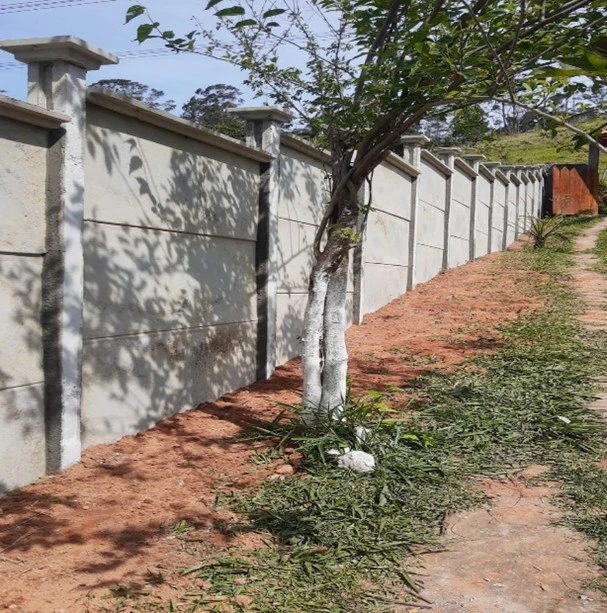 Muro pré moldado com altura de 2,0m sendo composto por 5 placas de 1,50m largura x 40 altura x 4cm espessura e mourão de 2,70m de altura x 12 espessura x 12 espessura aprofundados 0,60 cm no solo para cada peça. Com acabamento chapéu e pingadeira.